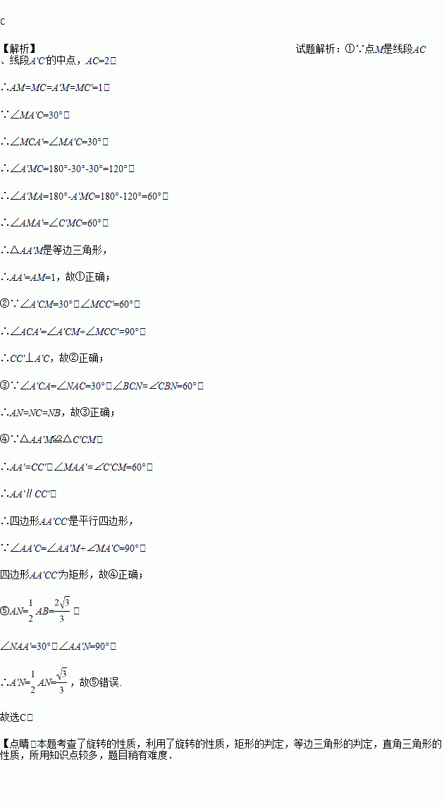 有两个全等的含30°角的直角三角板重叠在一起,如图,将△A′B′C′绕AC的中点M转动,斜边A′B′刚好过△ABC的直角顶点C,且与△ABC的斜边AB交于点N,连接AA′、C′C、AC′.若AC的长为2,有以下五个结论:①AA′=1;②C′C⊥A′B′;③点N是边AB的中点;④四边形AA′CC′为矩形;⑤A′N=B′C=