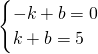 在y=kx+b中,当x=-1时,y=0;当x=1时,y=5,则k=________,b=________.