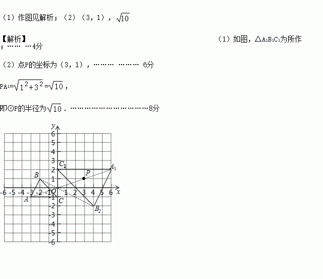 (2)利用方格纸标出△A1B1C1外接圆的圆心P,P点坐标是 ,⊙P的半径= .(保留根号)