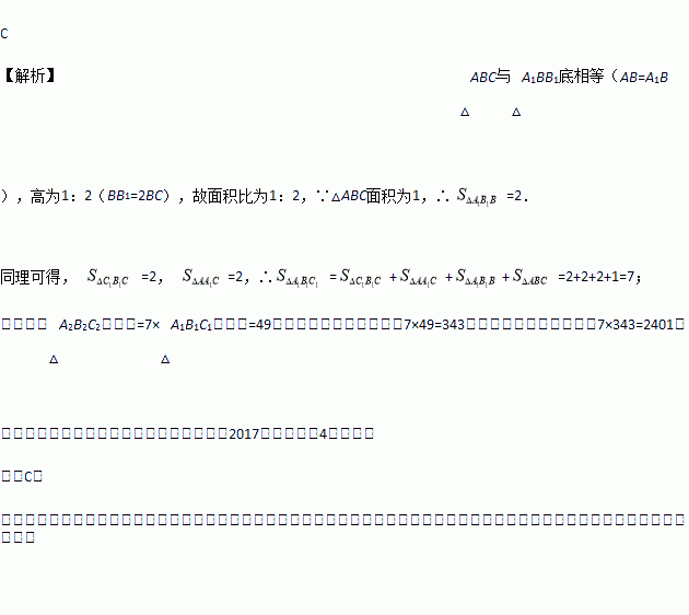 Èçͼ£¬¡÷ABCµÄÃæ»ýΪ1£®µÚÒ»´Î²Ù×÷£º·Ö±ðÑÓ³¤AB,BC,CAÖÁµãA1,B1,C1,ʹA1B=AB,B1C=BC,C1A=CA,˳´ÎÁ¬½ÓA1,B1,C1,µÃµ½¡÷A1B1C1£®µÚ¶þ´Î²Ù×÷£º·Ö±ðÑÓ³¤A1B1£¬B1C1£¬C1A1ÖÁµãA2£¬B2£¬C2£¬Ê¹A2B1=A1B1£¬B2C1=B1C1£¬C2A1=C1A1£¬Ë³´ÎÁ¬½ÓA2£¬B2£¬C2£¬µÃµ½¡÷A2B2C2£¬¡°´´Ë¹æÂÉ£¬ÒªÊ¹µÃµ½µÄÈý½ÇÐεÄÃæ»ý³¬¹ý2017£¬×îÉÙ¾¹ý£¨¡¡¡¡£©´Î²Ù×÷£®