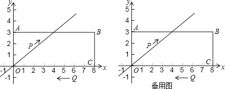 16.在平面直角坐标系中,矩形OABC的顶点A坐标为(0,3),顶点C坐标为(8,0).直线y=$\frac{3}{4}$x交AB于点D,点P从O点出发,沿射线OD方向以每秒a个单位长度的速度移动,同时点Q从C点出发沿x轴向原点O方向以每秒1个单位长度的速度移动,当点Q到达O点时,点P停止移动.连结PB,PC,设运动时间为t秒.