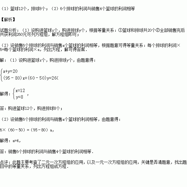 (7分)(2012•娄底)体育文化用品商店购进篮球和排球共20个,进价和售价如表,全部销售完后共获利润260元.