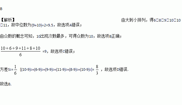 某校九年级体育模拟测试中,六名男生引体向上的成绩如下(单位:个):10、6、9、11、8、10,下列关于这组数据描述正确的是( )