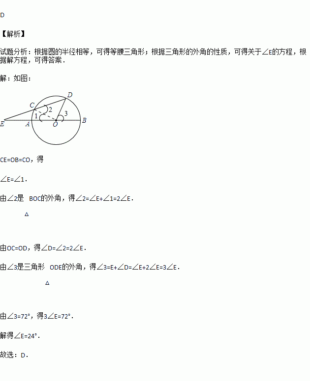 如图,⊙O的直径BA的延长线与弦DC的延长线交于点E,且CE=OB,已知∠DOB=72°,则∠E等于( )