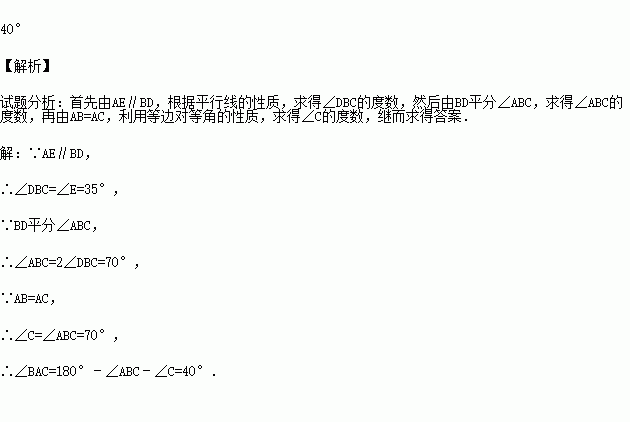 (2015秋•新泰市期末)如图,在△ABC中,AB=AC,BD平分∠ABC交AC于点D,AE∥BD交CB的延长线于点E,若∠E=35°,求∠BAC的度数.