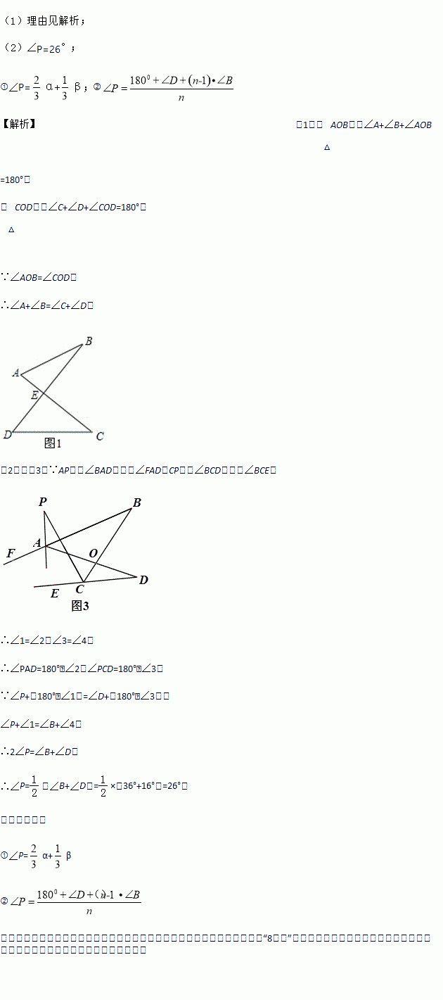 (2)阅读下面的内容,并解决后面的问题:如图2, AP、CP分别平分∠BAD. ∠BCD,若∠ABC=36°,∠ADC=16°,求∠P的度数;