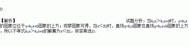 直线l1:y=k1x+b与直线l2:y=k2x在同一平面直角坐标系中的图象如图所示,则关于x的不等式k2x>k1x+b的解集为( )