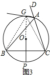 (3)延长PO交⊙O于G,连结GB、GC,根据垂径定理得GP垂直平分BC,则GB=GC,于是∠GBC=∠GCB,根据圆内接四边形的性质得∠DAG=∠GBC,根据圆周角定理得∠GAB=∠GCB,所以∠DAG=∠GAB,即AG平分∠BAD.