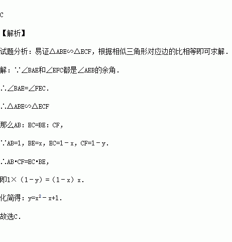 (2014•滨州二模)如图,正方形ABCD的边长为1,E、F分别是边BC和CD上的动点(不与正方形的顶点重合),不管E、F怎样动,始终保持AE⊥EF.设BE=x,DF=y,则y是x的函数,函数关系式是( )