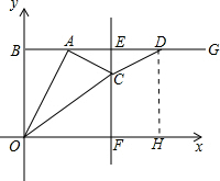 (2)过点D作DH⊥OF,垂足为H.先证明△OBA∽△AEC,由相似三角形的性质可知$\frac{EC}{AB}=\frac{AE}{OB}$,可求得EC=$\frac{1}{2}t$,从而得到点C的坐标为(t+4,8-$\frac{1}{2}t$),因为∠OCD=180°,CF∥DH,可知$\frac{OF}{OH}=\frac{FC}{DH}$,即$\frac{t+4}{t+8}=\frac{8-\frac{1}{2}t}{8}$从而可解得t的值;
