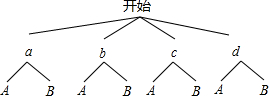 解答:解:(1)设四把不同的钥匙分别为a、b、c、d,两把不同的锁分别为A、B,且a、b分别能打开对应的锁,则画出如下树状图: