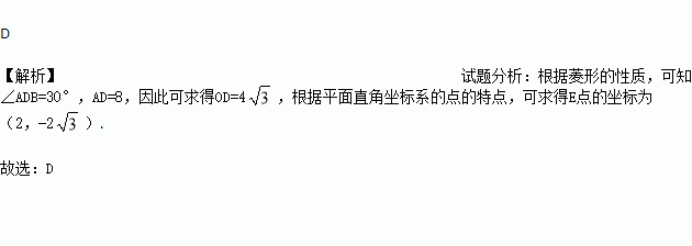 如图,在平面直角坐标系中,四边形ABCD是菱形,∠ABC=60°,且点A的坐标为(4,0),若E是AD的中点,则点E的坐标为( )