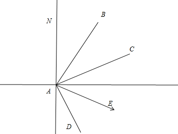 在飞机飞行时,飞机飞行方向是用飞行路线与实际的南或北方向线之间的夹角大小来表示的,用AN(南北线)与飞行线之间顺时针方向夹角作为飞行方向角,从A到B的飞行方位角为40°,从A到C的飞行方位角为75°,从A到D的飞行方位角为150°,试求AB与AC之间的夹角为多少度?AD与AC之间的夹角为多少度?并画出从A飞出且飞行方位角为115°的飞行线.