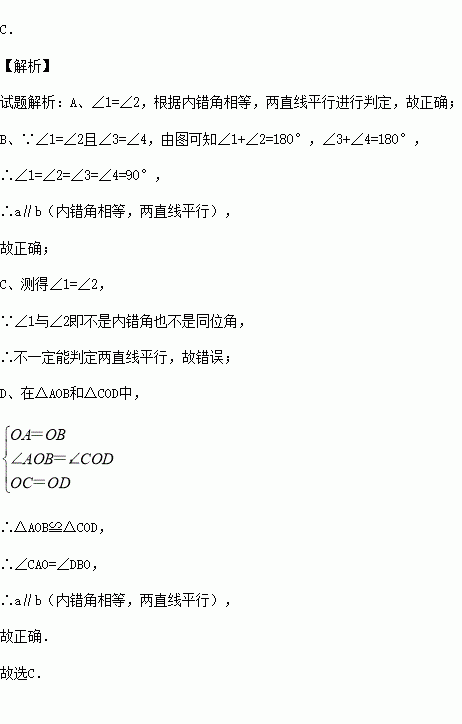 C.如图3,测得∠1=∠2