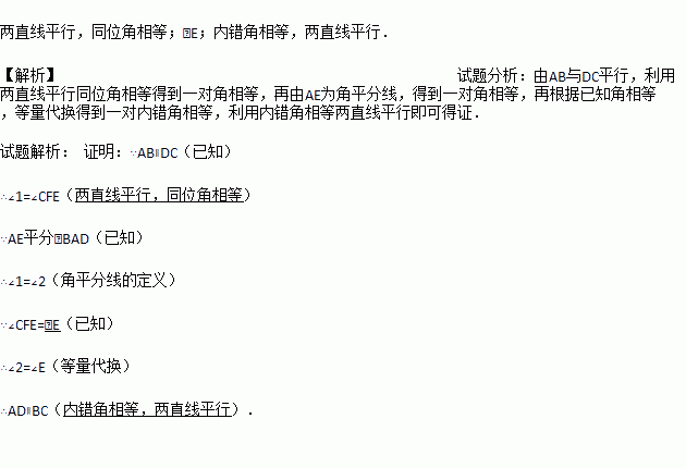 (本题满分6分)如图,已知AB∥DC,AE平分∠BAD,CD与AE相交于点F,∠CFE=∠E.试说明AD∥BC.完成推理过程:
