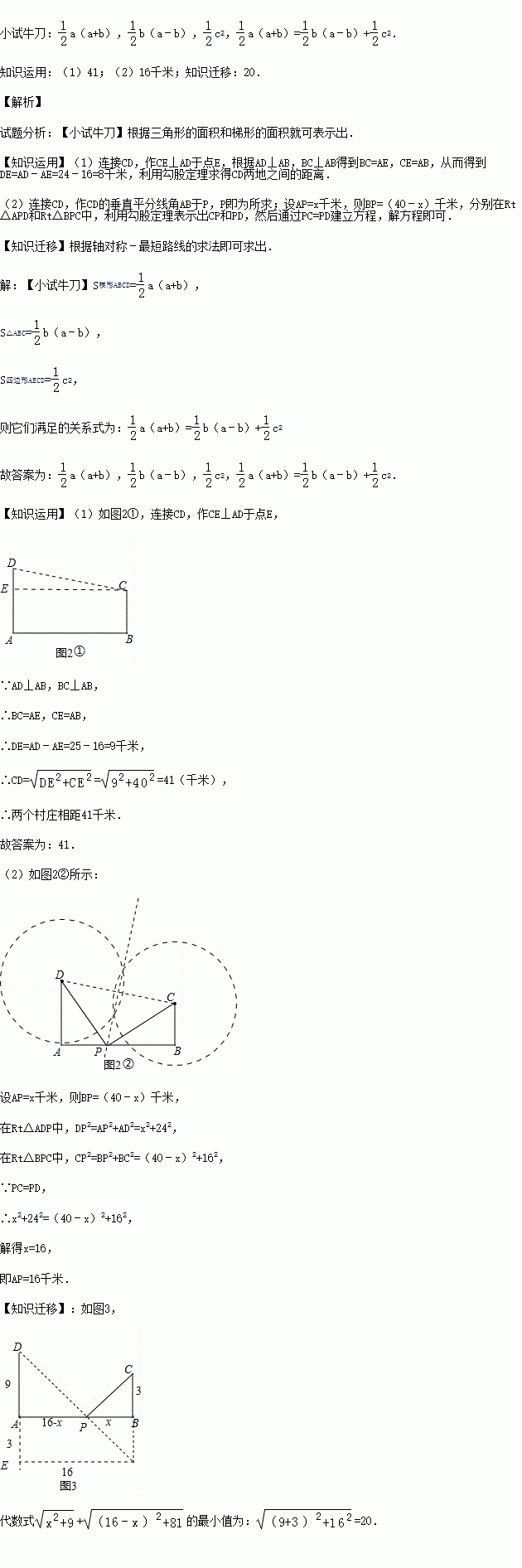 (1)如图2,铁路上A、B两点(看作直线上的两点)相距40千米,C、D为两个村庄(看作两个点),AD⊥AB,BC⊥AB,垂足分别为A、B,AD=25千米,BC=16千米,则两个村庄的距离为 千米(直接填空);