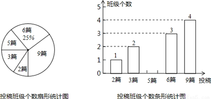 为积极响应市政府提出的“建设美丽南宁”的号召,我市某校在八,九年级开展征文活动,校学生会对这两个年级各班内的投稿情况进行统计,并制成了如图所示的两幅不完整的统计图.
