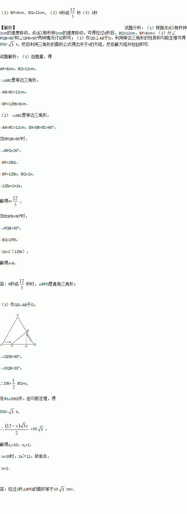 如图,在边长为12cm的等边三角形ABC中,点P从点A开始沿AB边向点B以每秒钟1cm的速度移动,点Q从点B开始沿BC边向点C以每秒钟2cm的速度移动.若P、Q分别从A、B同时出发,其中任意一点到达目的地后,两点同时停止运动,求: