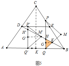 ②如图3中,当5<t≤7时,重叠部分是四边形QMHK.取BD的中点M′,作M′P′∥PM交DE于P′![]()