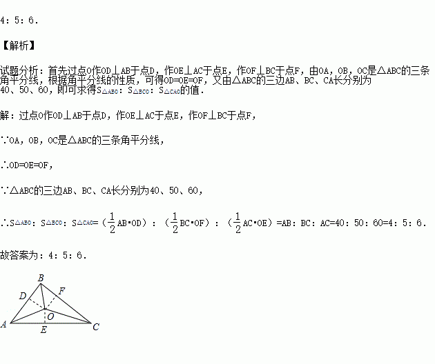 (2012•通辽)如图,△ABC的三边AB、BC、CA长分别为40、50、60.其三条角平分线交于点O,则S△ABO:S△BCO:S△CAO= .