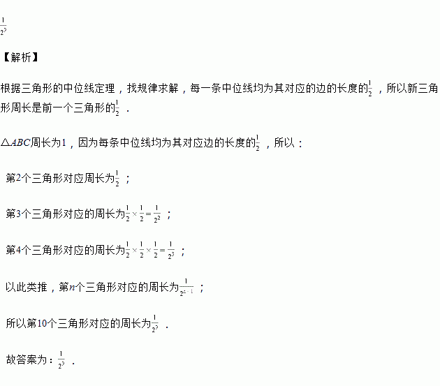 如图,已知△ABC的周长为1,连接△ABC三边的中点构成第二个三角形,再连接第二个三角形三边的中点构成第三个三角形,…,依此类推,则第10个三角形的周长为_______