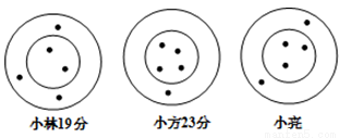 小林、小芳和小亮三人玩飞镖游戏,各投5支飞镖,规定在同一圆环内得分相同,中靶和得分情况如图,则小亮的得分是________分.