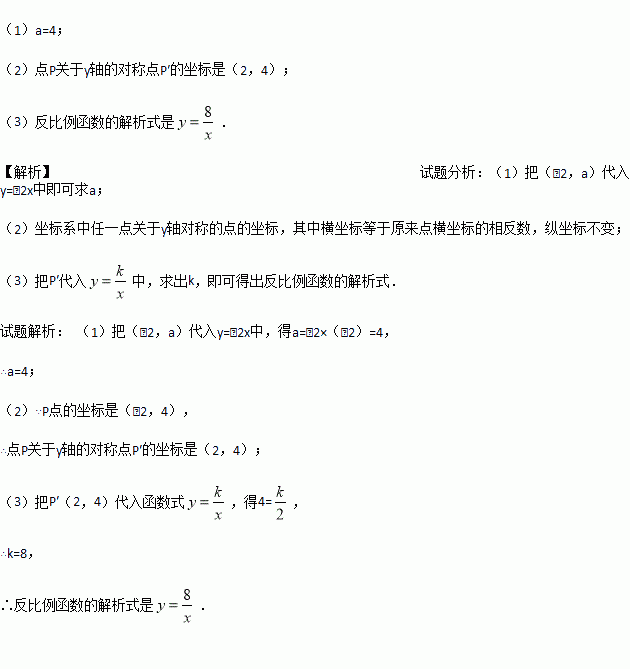 如图,已知直线y=-2x经过点P(-2,a),点P关于y轴的对称点P'在反比例函数y =