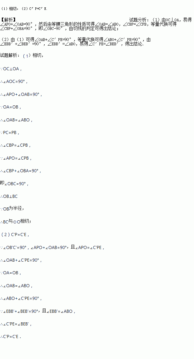 如图2,记(1)中⊙O的切线为直线l,在(1)的条件下,将切线l向下平移,设平移后的直线l与OB的延长线相交于点B′,与AB的延长线相交于点E,与OP的延长线相交于点C′,找出图2中与C′P相等的线段,并说明理由.