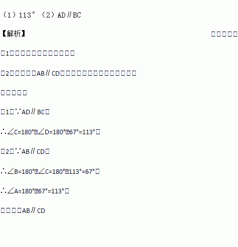 由于被墨水污染,一道几何题仅能见到如图所示的图形和文字:“如图,已知:四边形ABCD中,AD∥BC,∠D=67°,…”