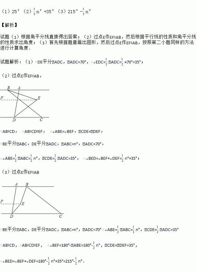 如图,已知AB∥CD,C在D的右侧,BE平分∠ABC,DE平分∠ADC,BE、DE所在直线交于点E,∠ADC =70°.
