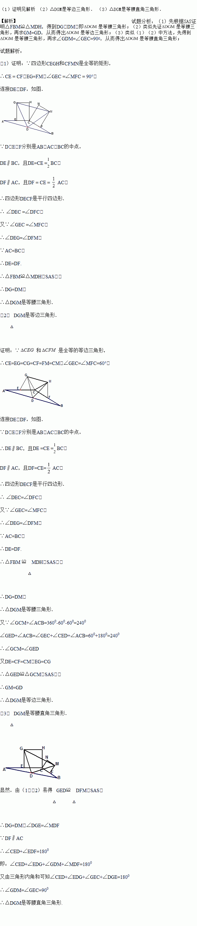 中,AC=BC,点D是边AB的中点,E,F分别是AC和BC的中点,分别以CE,CF为一边向上作两个全等的矩形CEGH和矩形CFMN(其中EG=FM),依次连结DG、DM、GM。