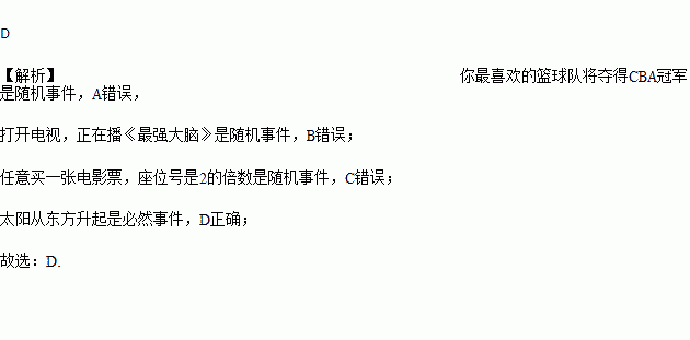 C. 任意买一张电影票,座位号是2的倍数 D. 太阳从东方升起