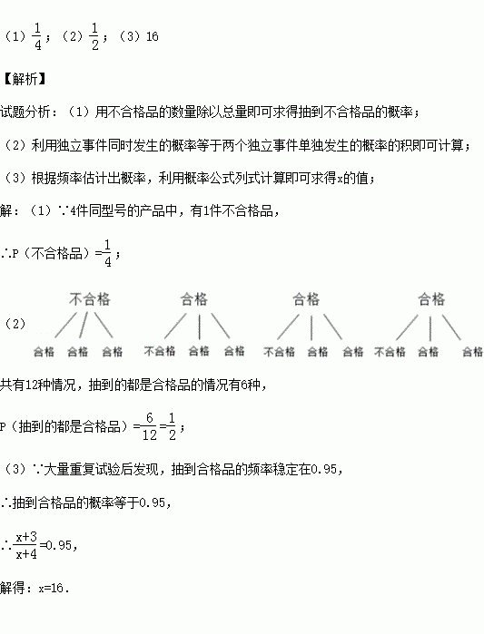 (3)在这4件产品中加入x件合格品后,进行如下试验:随机抽取1件进行检测,然后放回,多次重复这个试验,通过大量重复试验后发现,抽到合格品的频率稳定在0.95,则可以推算出x的值大约是多少?