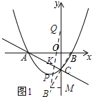 £¨2£©Èçͼ1Ëùʾ£ºÔÚRt¡÷AOCºÍRt¡÷OBCÖУ¬ÀûÓÃÌØÊâÈñ½ÇÈý½Çº¯ÊýÖµ¿ÉÖªÇóµÃ¡ÏABC=60¡ã£¬¡ÏBCO=30¡ã£¬´Ó¶øµÃµ½¡ÏACB=90¡ã£¬ÑÓ³¤BCÖÁB¡äʹB¡äC=BC£¬Á¬½ÓQB¡ä½»ACÓÚµãK£¬´Ëʱ¡÷BQKÖܳ¤×îС£¬¸ù¾ÝÖá¶Ô³ÆµÄÐÔÖÊ¿ÉÖªµãB¡äµÄ×ø±êΪ£¨-1£¬-2$\sqrt{3}$£©£¬È»ºó¿ÉÇóµÃÖ±ÏßQB¡äµÄ½âÎöʽΪy=3$\sqrt{3}x+\sqrt{3}$£¬È»ºó½«y=3$\sqrt{3}x+\sqrt{3}$Óëy=$\frac{\sqrt{3}}{3}{x}^{2}+\frac{2}{3}\sqrt{3}x-\sqrt{3}$£¬×é³É·½³Ì×é¿ÉÇóµÃµãPµÄ×ø±ê£¬×îºóÔÚRt¡÷OBQºÍRt¡÷MB¡äQÖУ¬ÀûÓù´¹É¶¨ÀíÇóµÃQB¡äÓëQB³¤¶È¼´¿ÉÇóµÃ¡÷BQKµÄ×îСֵ£»
