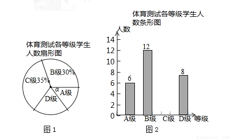 为了解中考体育科目训练情况,某县从全县九年级学生中随机抽取了部分学生进行了一次中考体育科目测试(把测试结果分为四个等级:A级:优秀;B级:良好;C级:及格;D级:不及格),并将测试结果绘成了如下两幅不完整的统计图.请根据统计图中的信息解答下列问题:![]()
