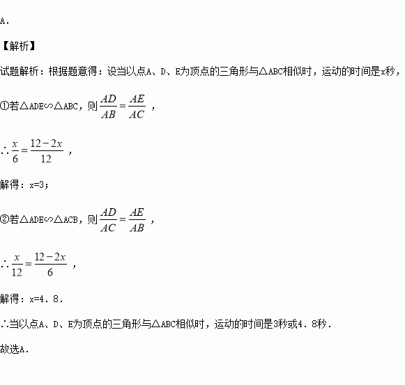 如图,在钝角三角形ABC中,AB=6cm,AC=12cm,动点D从A点出发到B点止,动点E从C点出发到A点止.点D运动的速度为1cm/秒,点E运动的速度为2cm/秒.如果两点同时运动,那么当以点A、D、E为顶点的三角形与△ABC相似时,运动的时间是( )
