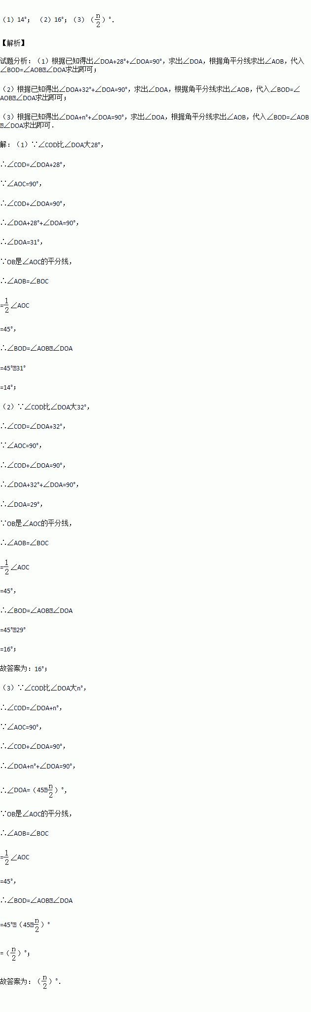 (3)将已知条件中的28°改为n°,则∠BOD= .