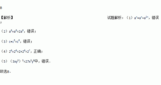 下列计算:(1)an•an=2an,(2)a6+a6=a12,(3)c•c5=c5,(4)26+26=27,(5)(3xy3)3=9x3y9中,正确的个数为( )
