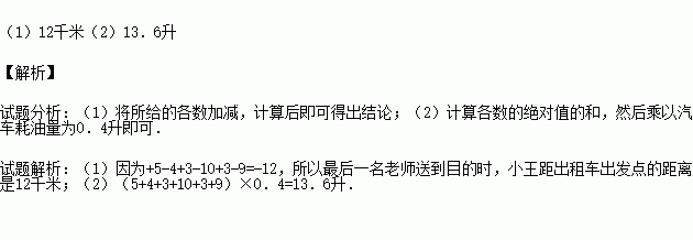 为体现社会对老师的尊重,教师节这一天上午,出租车司机小王在东西向的公路上免费接送老师,如果规定向东为正,向西为负,出租车的行程如下(单位:千米):+5,-4,+3,-10,+3,-9.