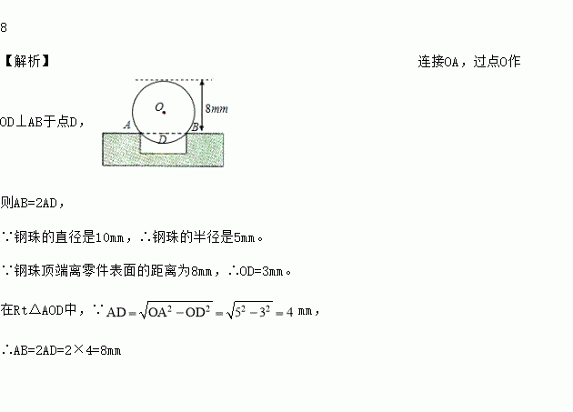 工程上常用钢珠来测量零件上小圆孔的宽口,假设钢珠的直径是10mm,测得钢珠顶端离零件表面的距离为8mm,如图所示,则这个小圆孔的宽口AB的长度为 ▲ mm.