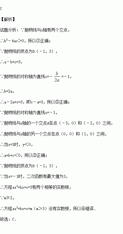 已知抛物线y=ax2+bx+c的顶点为D(﹣1,3),与x轴的一个交点在(﹣3,0)和(﹣2,0)之间,其部分图象如图,则以下结论: