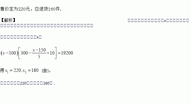 现将进货单价为100元的商品按每件150元售出时,就能卖出300件。已知这批商品每件涨价5元,其销售量将减少10件.问为了赚取19200元利润,同时也考虑尽量减轻销售人员的工作量,问售价应定为多少?这时应进货多少件?