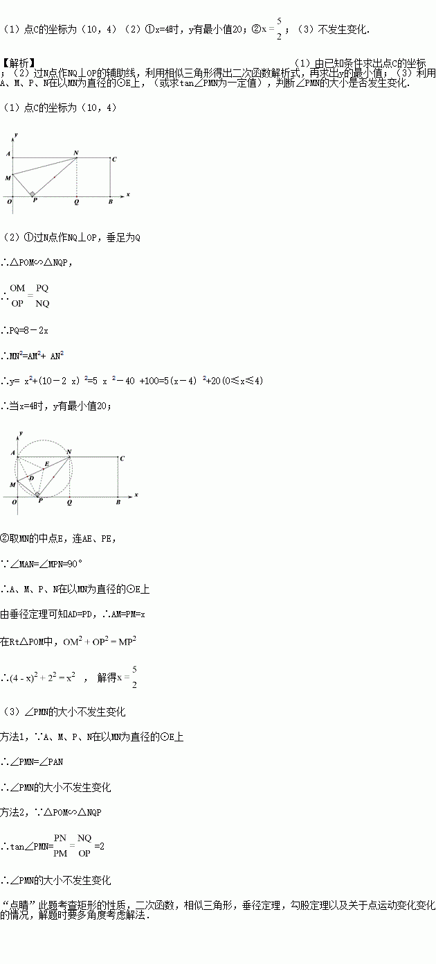 Èçͼ1£¬ÔÚÆ½ÃæÖ±½Ç×ø±êϵÖУ¬ÓоØÐÎAOBC£¬µãA¡¢BµÄ×ø±ê·Ö±ðΪ£¨0£¬4£©¡¢£¨10,0£©£¬µãPµÄ×ø±êΪ£¨2£¬0£©£¬µãMÔÚÏß¶ÎAOÉÏ£¬µãNÔÚÏß¶ÎACÉÏ£¬×ÜÓСÏMPN=90 º£¬µãM´ÓµãOÔ˶¯µ½µãA£¬µ±µãMÔ˶¯µ½Aµãʱ£¬µãNÓëµãCÖØºÏ£¨Èçͼ2£©¡£ÁîAM=x