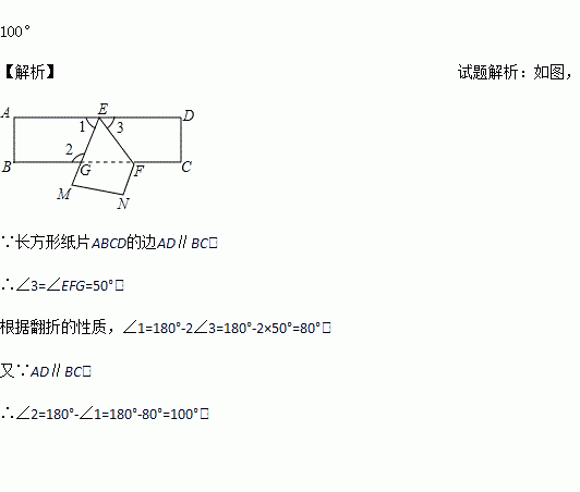 如图,把一张长方形纸片ABCD沿EF折叠后ED与BC的交点为G,D、C分别在M 、N的位置上,若∠EFG=50°,则∠2=_________.