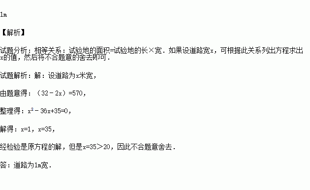 如图,在长为32m,宽为20m的矩形耕地上,修筑同样宽的三条道路,把耕地分成大小不等的六块作实验田,要使试验田面积为570m2,道路的宽应为多少?