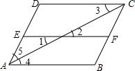 分析:先根据对顶角相等得出∠1=∠2,再由AC平分∠DAB可∠4=∠5,再根据AB∥CD,EF∥AB可知AB∥CD∥EF,故∠2=∠3=∠4,由此可得出结论.