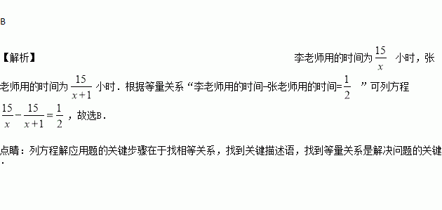 张老师和李老师同时从学校出发,步行15千米去县城购买书籍,张老师比李老师每小时多走1千米,结果比李老师早到半小时,两位老师每小时各走多少千米?设李老师每小时走x千米,依题意,得到的方程是:( )