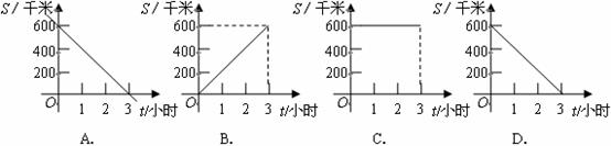 2007年我国铁路进行了第六次大提速,一列火车由甲市匀速驶往相距600千米的乙市,火车的速度是200千米/小时,火车离乙市的距离s(千米)随行驶时间t(小时)变化的关系用图象表示是图中的( )