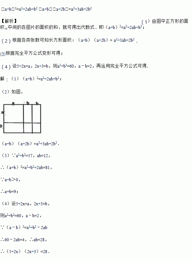 (3)如果图中的a,b(a>b)满足a2+b2=57,ab=12,求a+b的值;