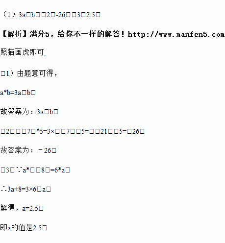 定义一种新运算:观察下列式子:1*3=1×3﹣3=0;3*(﹣1)=3×3+1=10;4*6=4×3﹣6=6;5*(﹣2)=5×3+2=17.(1)请你想一想:a*b=______(2)(﹣7)*5=______(3)若a*(﹣8)=6*a请求出a的值